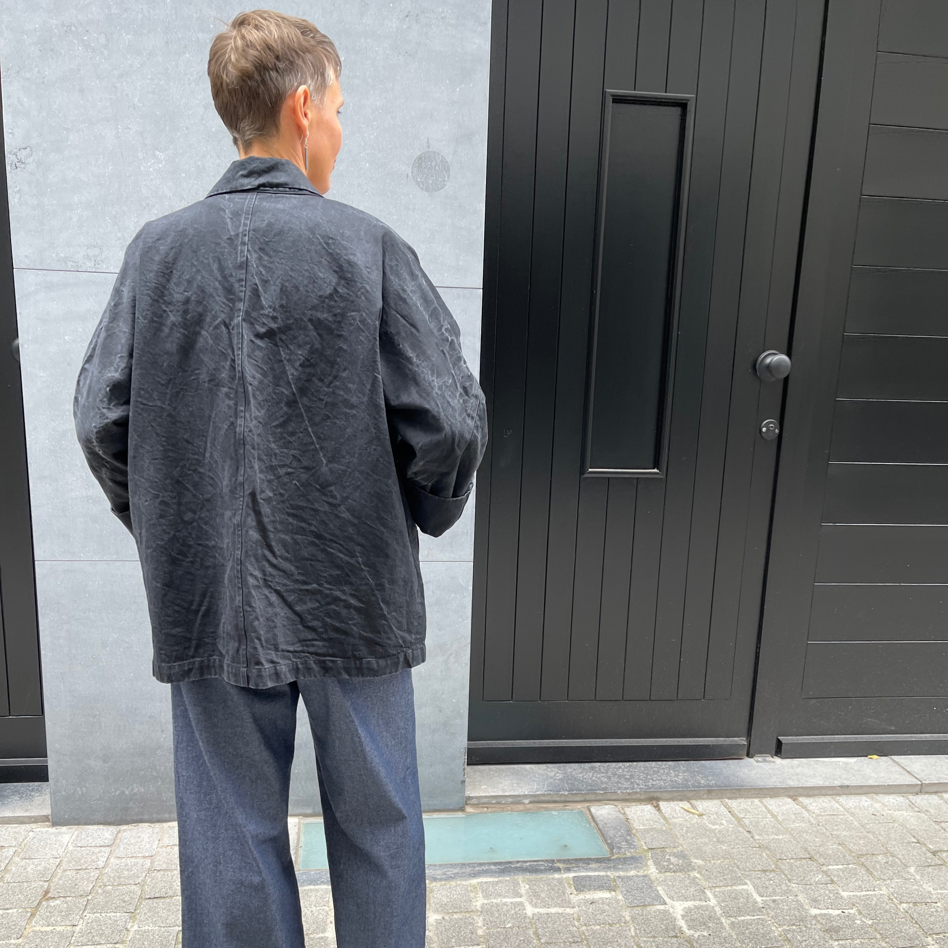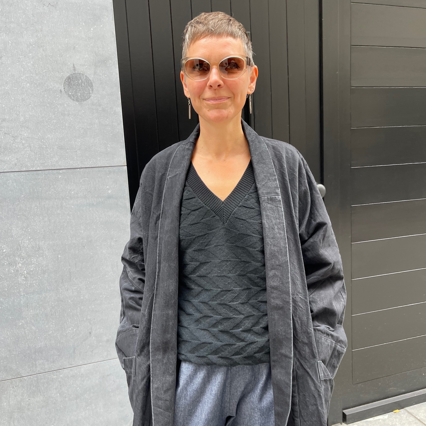 Timeless Style for Every Occasion. Elevate your wardrobe with our POINTY Kimono, a sophisticated and modern design that seamlessly blends fashion and function. Cracked look. This gender-neutral kimono features a sleek collar, beautifully topstitched front pockets, and charming double cuffs—offering a perfect balance of timeless elegance and contemporary appeal.
